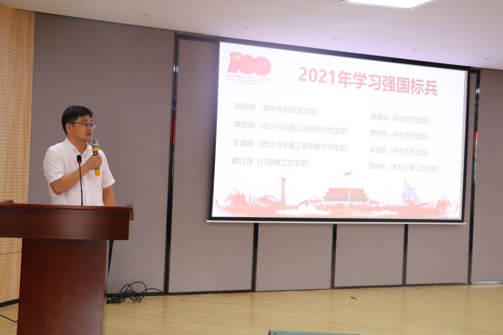 张宾同志宣读了各类先进名单,表彰了我院各类先进个人和组织,他们充分展示了我院各党支部和广大党员的风采。在欢快的颁奖曲中,李建峰同志、胡良根同志和俞金波同志分别为优秀微党课代表、学习强国标兵和锋领党员进行了颁奖。鼓励他们充分发挥党员先锋作用,积极推进学院工作,为学院各项事业发展做出更大贡献。