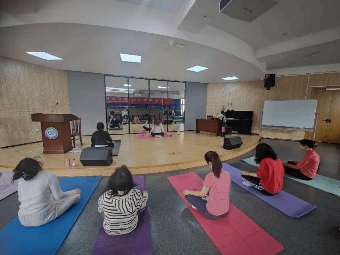 瑜伽教练首先向大家讲解了瑜伽的理念和练习的注意事项,然后示范了瑜伽的基础动作。针对女教工伏案工作中容易出现的肩颈腰椎问题,教练设置了对应的舒缓拉伸动作。在教练的引导下,大家进行了呼吸与拉伸训练,伴随着音乐,在身体的前屈、后展、扭转中感受身体的放松和精神的愉悦。