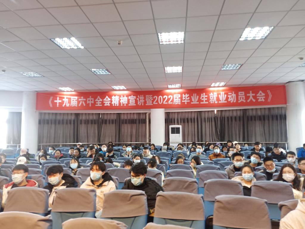 为学习贯彻落实十九届六中全会精神,解决大学生急难愁盼问题,进一步做好2022届毕业生就业工作,帮助毕业生同学熟悉就业政策、了解就业形势、把握就业机会,12月30日学院于9号楼317报告厅召开十九届六中全会精神宣讲暨2022届毕业生就业动员大会。学工办、教务办、研究生办、各毕业班班主任及全体2022届毕业生参加大会。学院党委书记俞金波出席大会并做专题辅导报告。会议由学工办主任张宾主持。
