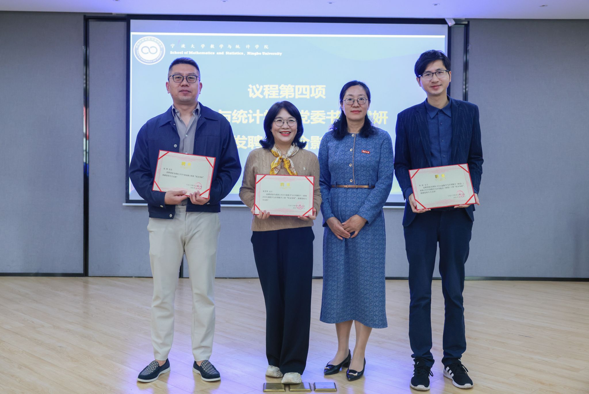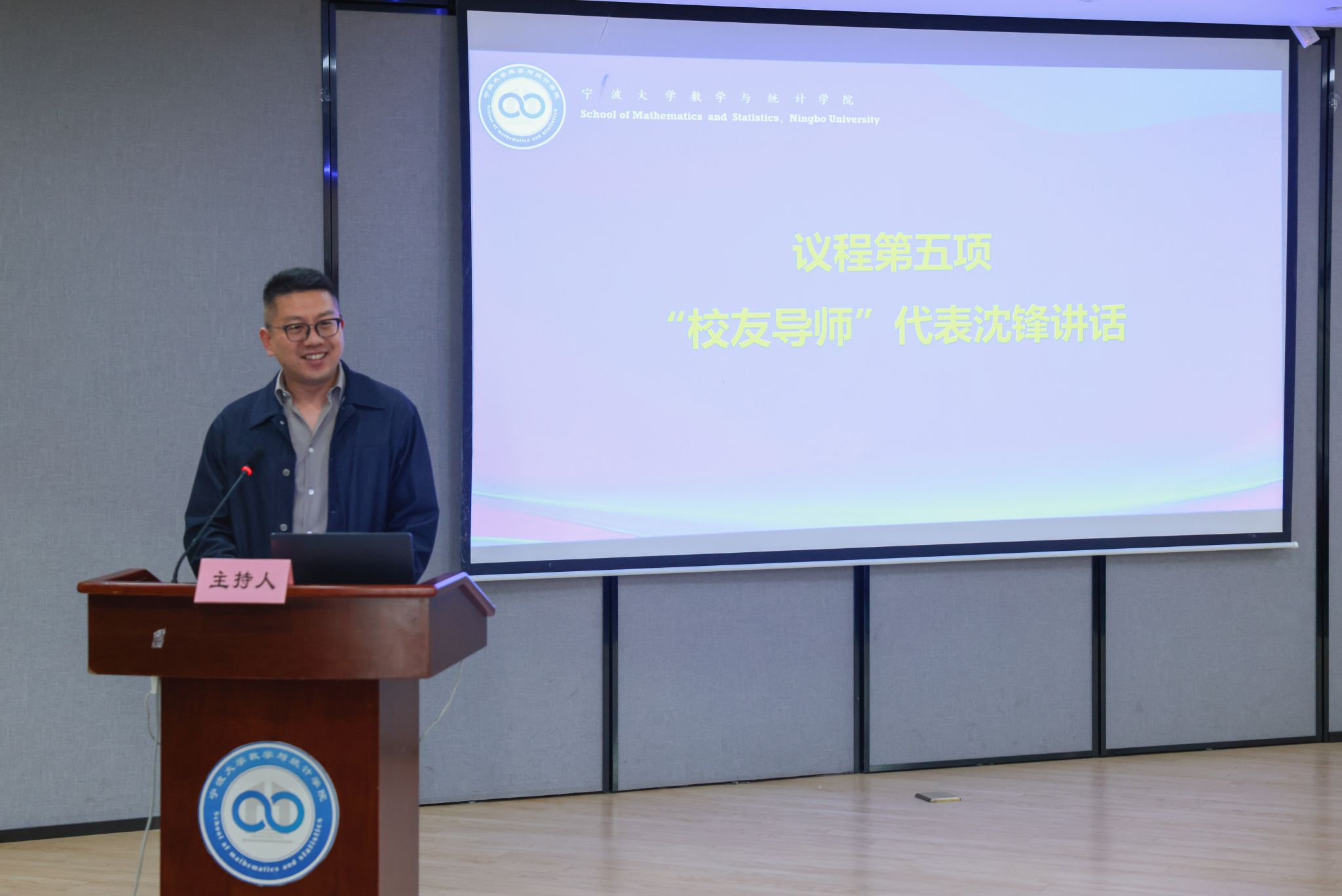 随后,院党委副书记姜萍宣读聘任文件。党委书记霍妍为朱芳华、沈锋、岑妙三位校友导师颁发聘书并合影留念。校友导师代表、2004届信息与计算科学专业毕业生、宁波和盛达能源科技有限公司创始人沈锋发表感言。他感恩母校的培养,强调宁大的严谨数理逻辑训练。他以自身创业经历为例(2008年创立和谐节能科技,2016年创办和盛达能源科技),生动阐释数学建模、统计分析、优化算法如何解决化工能源网络、钢铁低碳改造等产业难题。沈锋指出创业如解复杂应用题,需要不断“转型突破”,而宁大培养的坚韧精神与逻辑思维是核心支撑。他鼓励同学们以学院“逻辑高度”为纵轴,以产业“创新广度”为横轴,绘制独特成长坐标,并深情表示母校与校友导师永远是学子“验证人生解”的精神家园。
