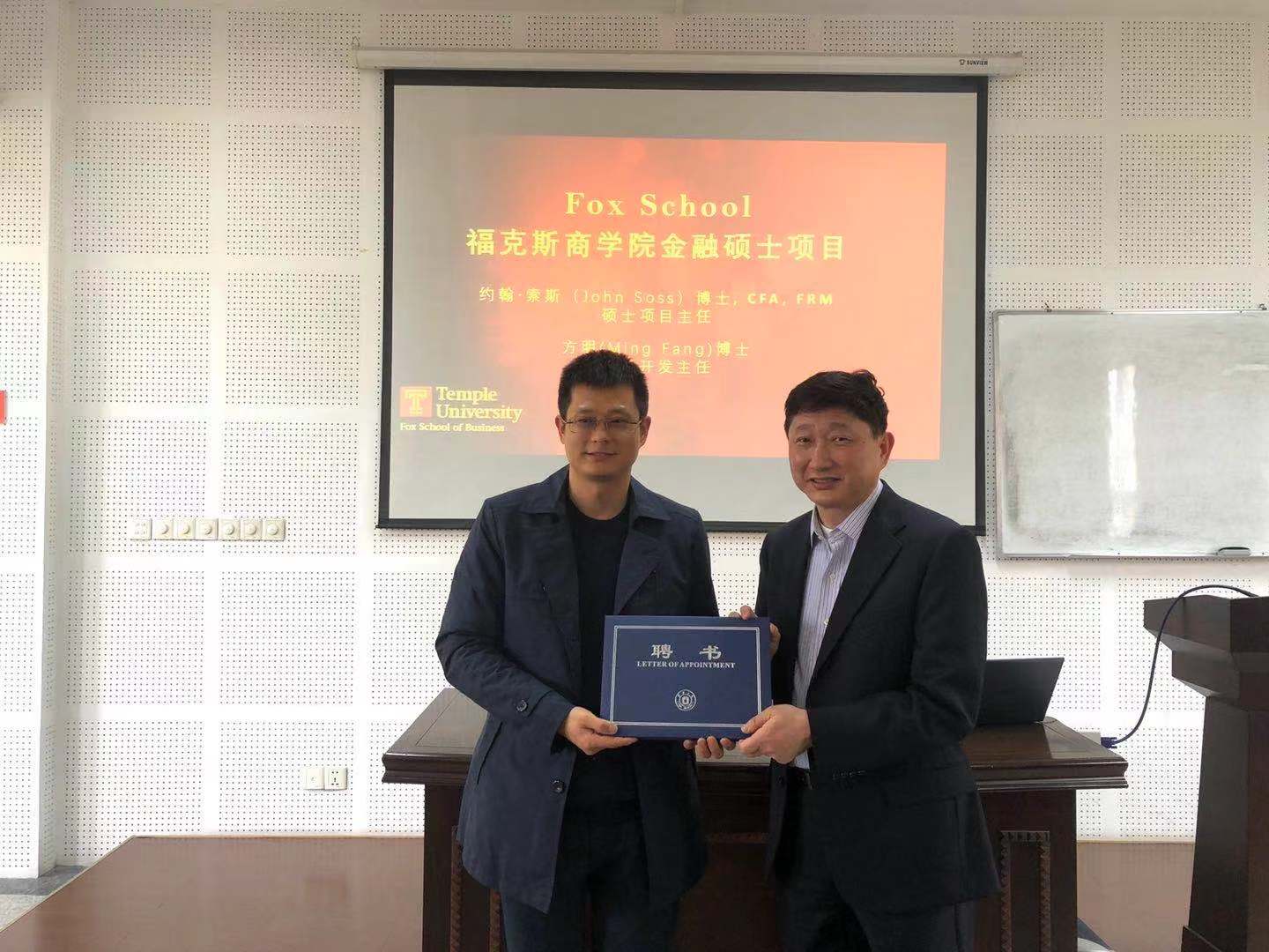 近日,美国天普大学的方明教授一行来acg港湾 交流,我院党委书记俞金波为天普大学方教授颁发了acg港湾 兼职教授聘书。方教授和SOSS教授给acg港湾 广大师生介绍了天普大学-acg港湾 合作项目。天普大学(Temple University)金融、精算相关专业有相当实力,与acg港湾 有长期合作关系,目前已有三位acg港湾 毕业生在天普大学深造。