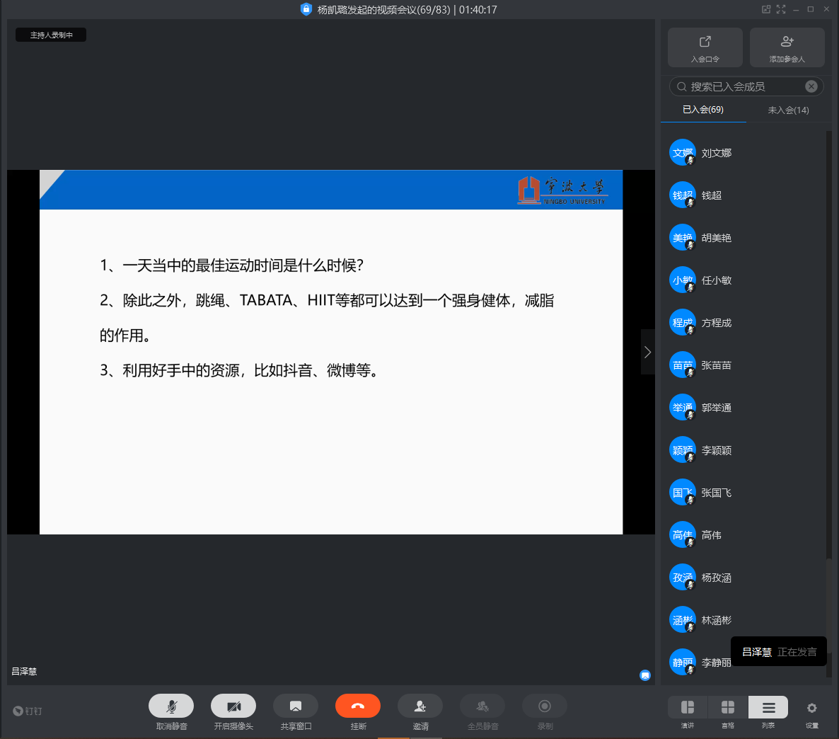 讲座围绕"身心的成长 一生的财富”主题展开,第一环节米老师介绍了在疫情期间容易出现的一些心理问题和如何去调节长时间居家在线学习出现的心理危机。详细介绍后,同学们结合自己的情况向米老师现场互动咨询,米老师都一一做出详细的解答。第二环节吕泽慧分享了居家期间可以做的居家运动以及相关注意事项,并与同学们积极互动讨论,气氛热烈。在活动最后,与会同学们现场参与了健康知识小竞答。