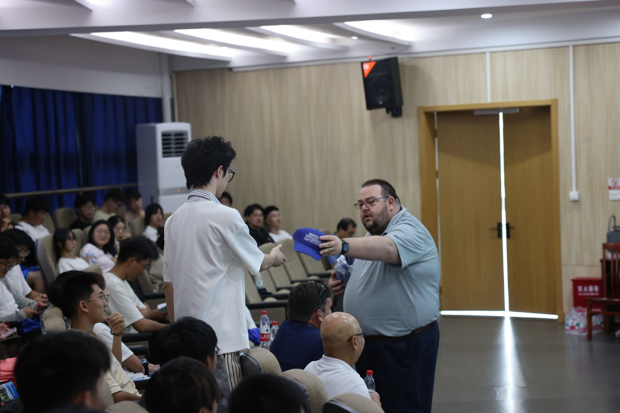 当日下午,代表团还与精算专业的近80名学生举行了见面会。Robert SUMMERS详细介绍了MTSU的整体情况及国际学生支持政策,Chris STEPHENS和Lu XIONG就精算专业的课程体系、学习内容及发展前景进行了具体说明。此后学生提问环节气氛热烈,学生们就赴美留学申请、奖学金政策、学业与生活适应等关心的问题与MTSU的教授们进行了直接交流。
