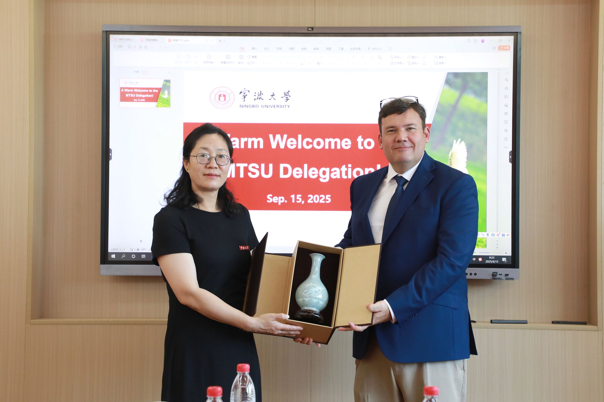 座谈结束后,学院向MTSU代表团赠送了越窑青瓷花瓶,寓意“精诚合作,花开并蒂”。双方与会代表合影留念,共同铭记这一深化友谊与合作的时刻。