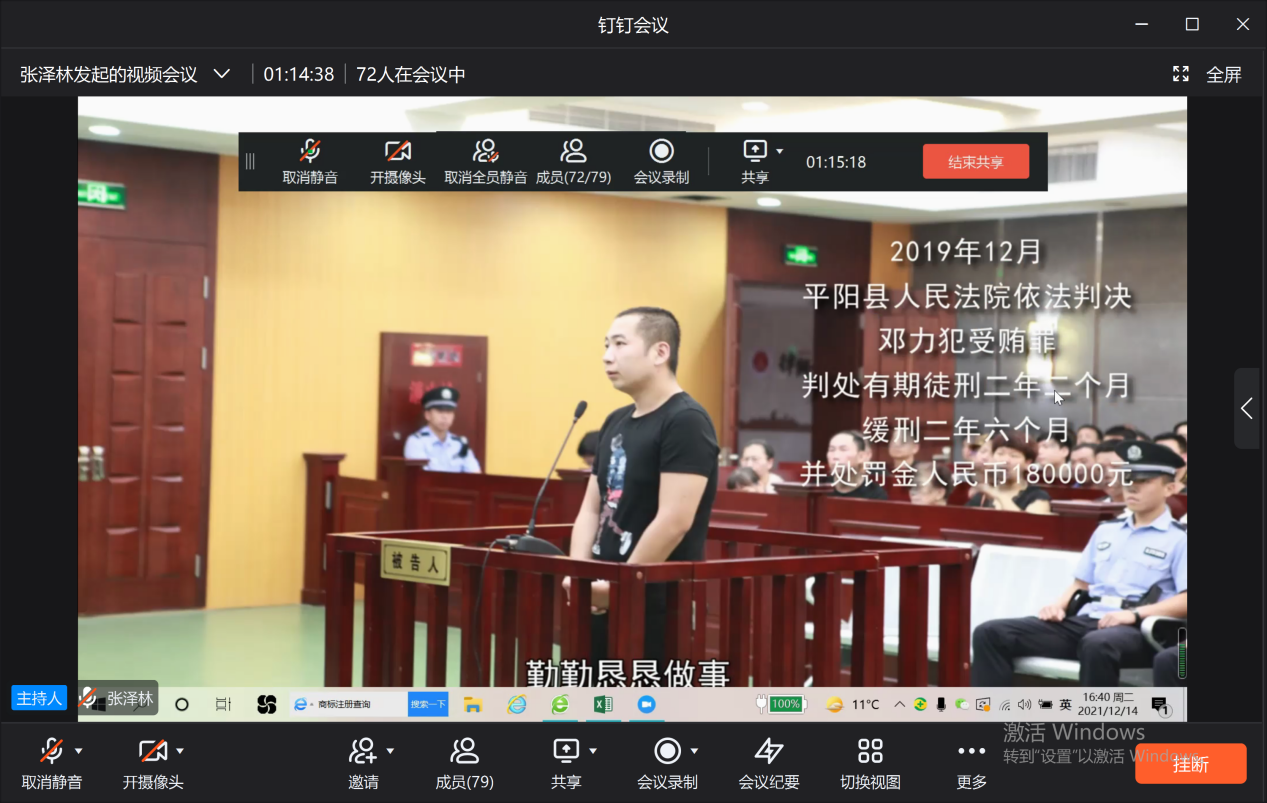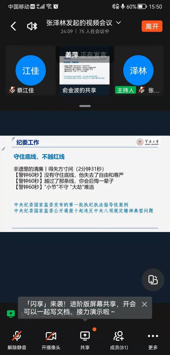 2021年12月14日,为了深入贯彻落实全面从严治党要求,进一步严明政治纪律和政治规矩,全面推进“清廉宁大”和“清廉学院”建设,acg港湾 利用钉钉会议线上开展以“坚守底线,不越红线”为主题的廉政专题学习会。会议由学院党委书记俞金波主持。