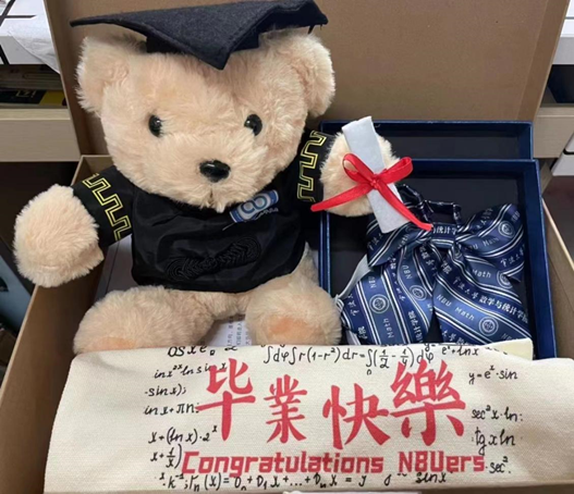 的毕业晚会现场,2022届毕业生们惊喜地收到了一个印有“前程似锦”的蓝色毕业专属礼盒,打开以后除了一个可爱小熊和定制帆布包,还有一条领带和一封廉洁信。